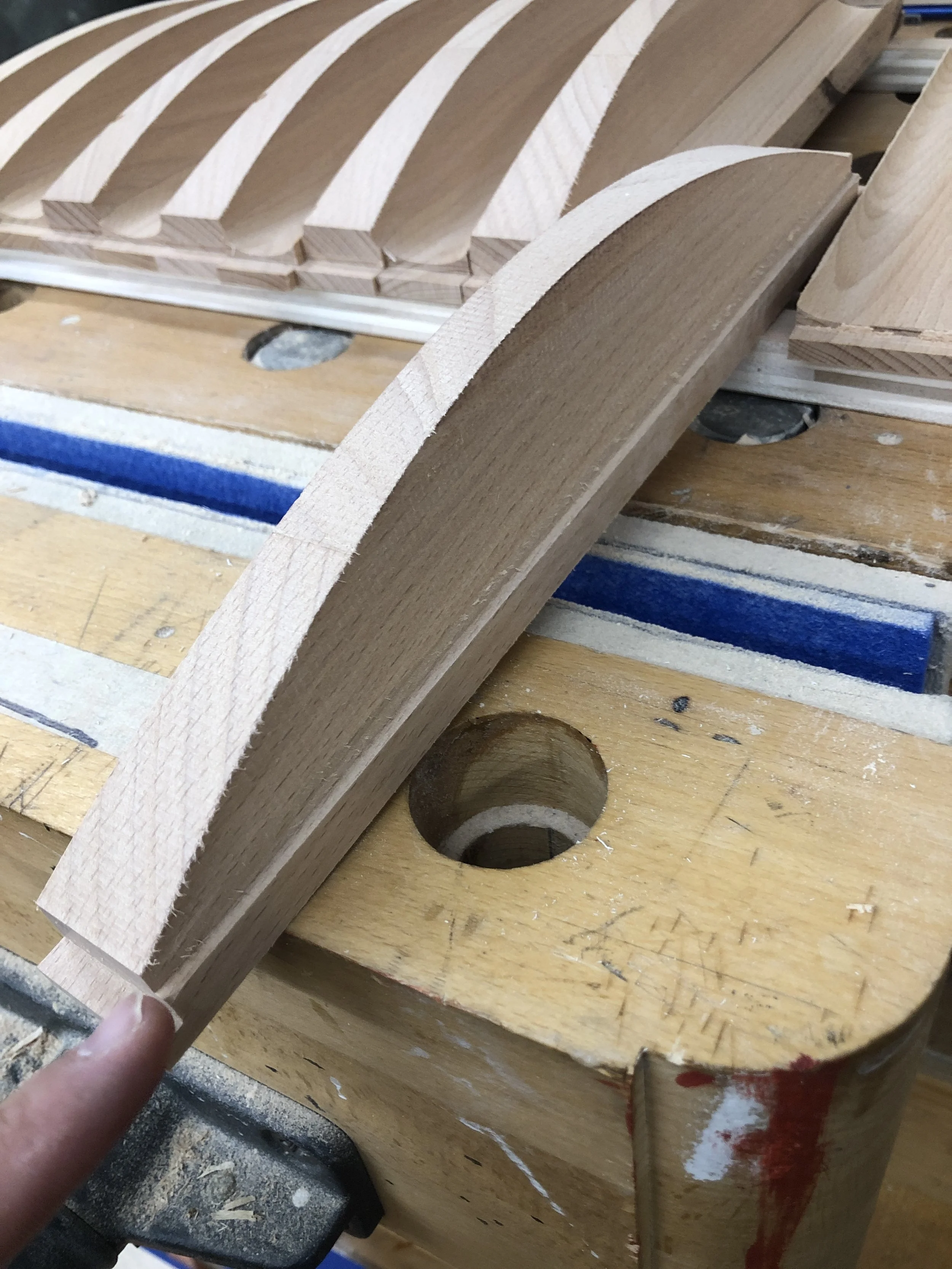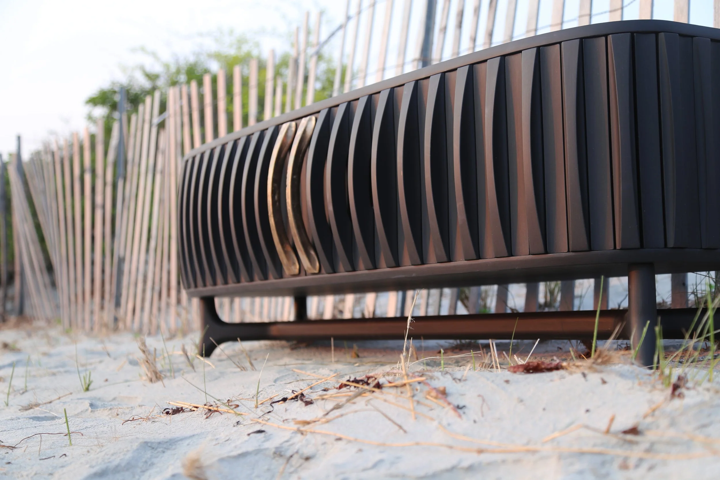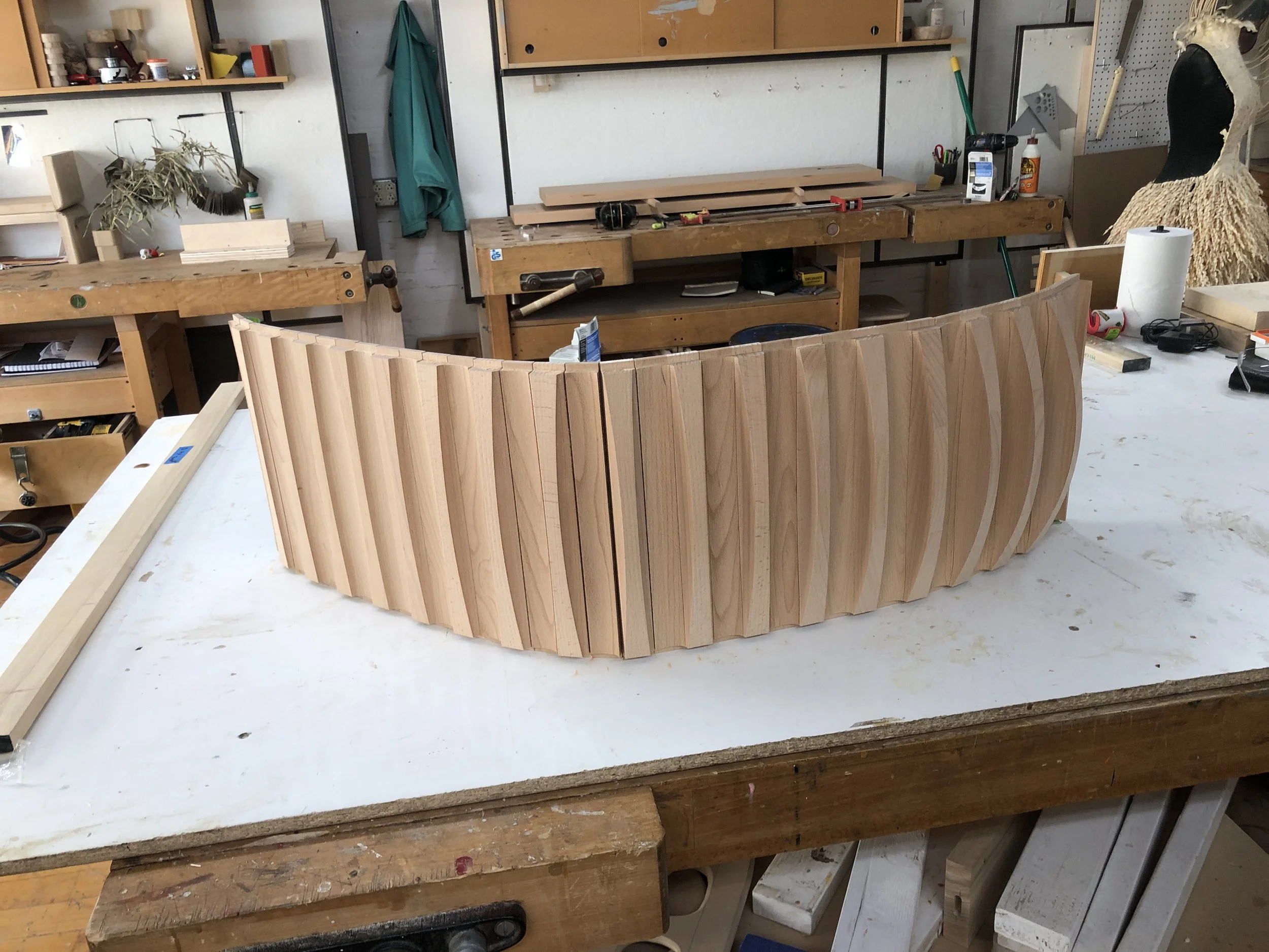 Inspired by the sweep of a rib cage, the Breast Bone Cabinet was an exercise in pushing inspiration from superficial ornamentation to core concept. The tambour doors, initially envisioned as hinged panels, allowed for the compounding curvature that captures the volume of the rib cage. Graduating hollows in the center of the wooden ribs and the light stance of the base contribute to a levity and organic quality, while natural pitting that occurred in the cast bronze handles mimics the porous nature of bones. The black milk paint shrouds the hidden warmth of natural wood that exists inside the form.