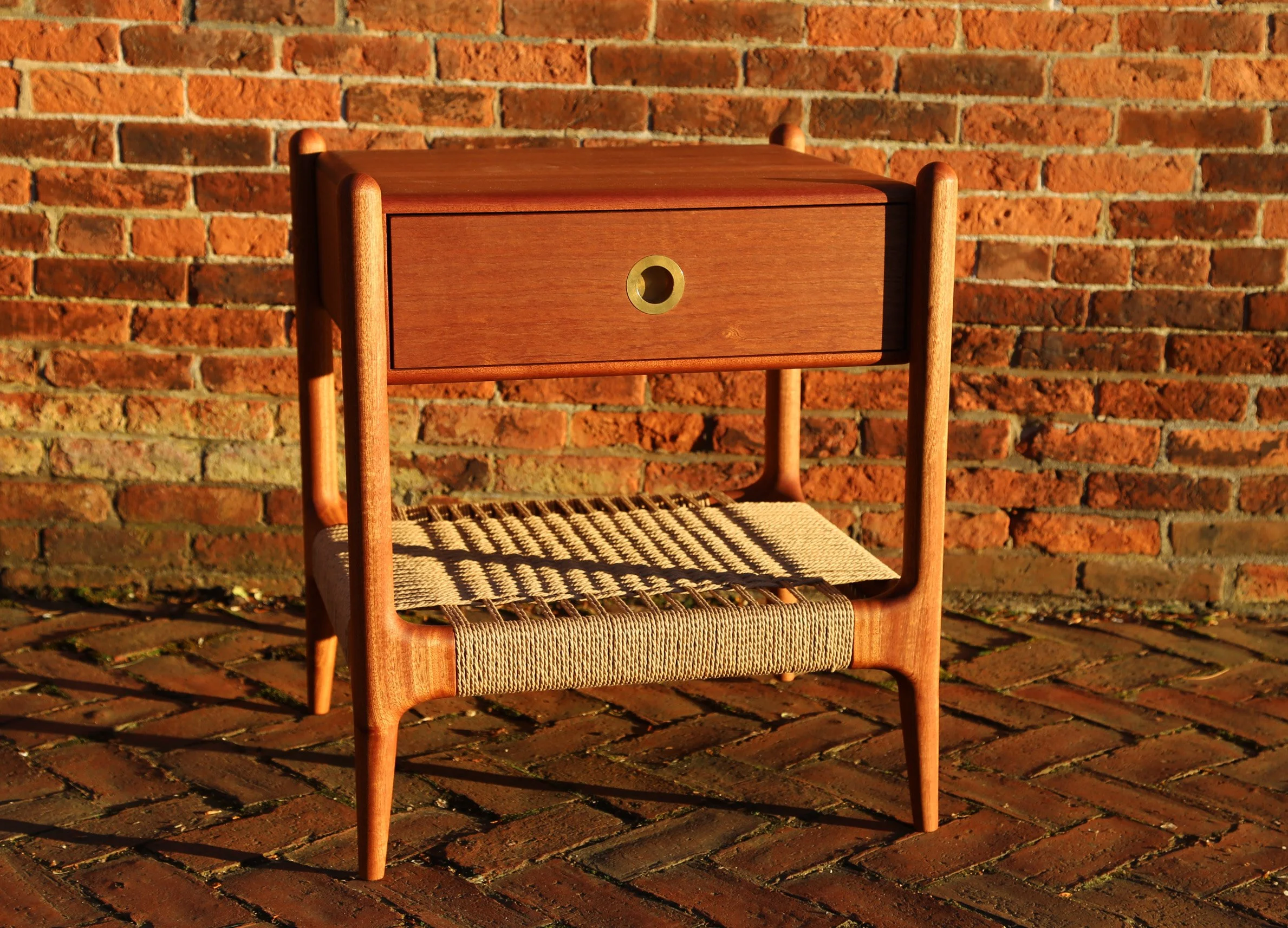 the Sinnet Nightstands sought to carry the lines from the Hawser Bed into a more compact form. Similar weaving technique and flowing transitions harken to the Hawser, while non side-specific legs allowed for streamlined fabrication on the CNC. Pockets in the legs register the case neatly and hold it secure, but maintain the airiness of the papercord shelf.